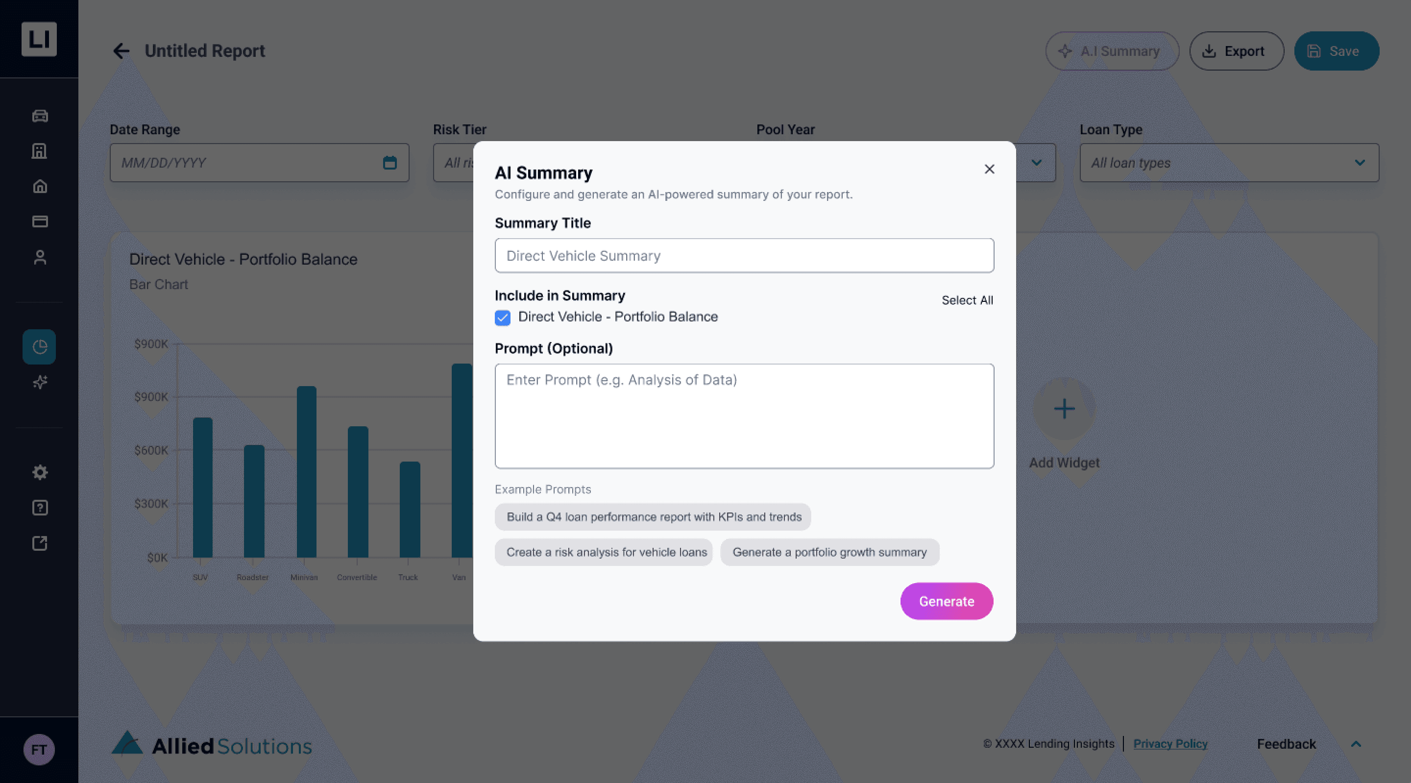 Lending Insights is Allied Solutions’ BI platform for credit unions. Every month, lending leaders need audit-ready reports and a high-level view of portfolio performance.