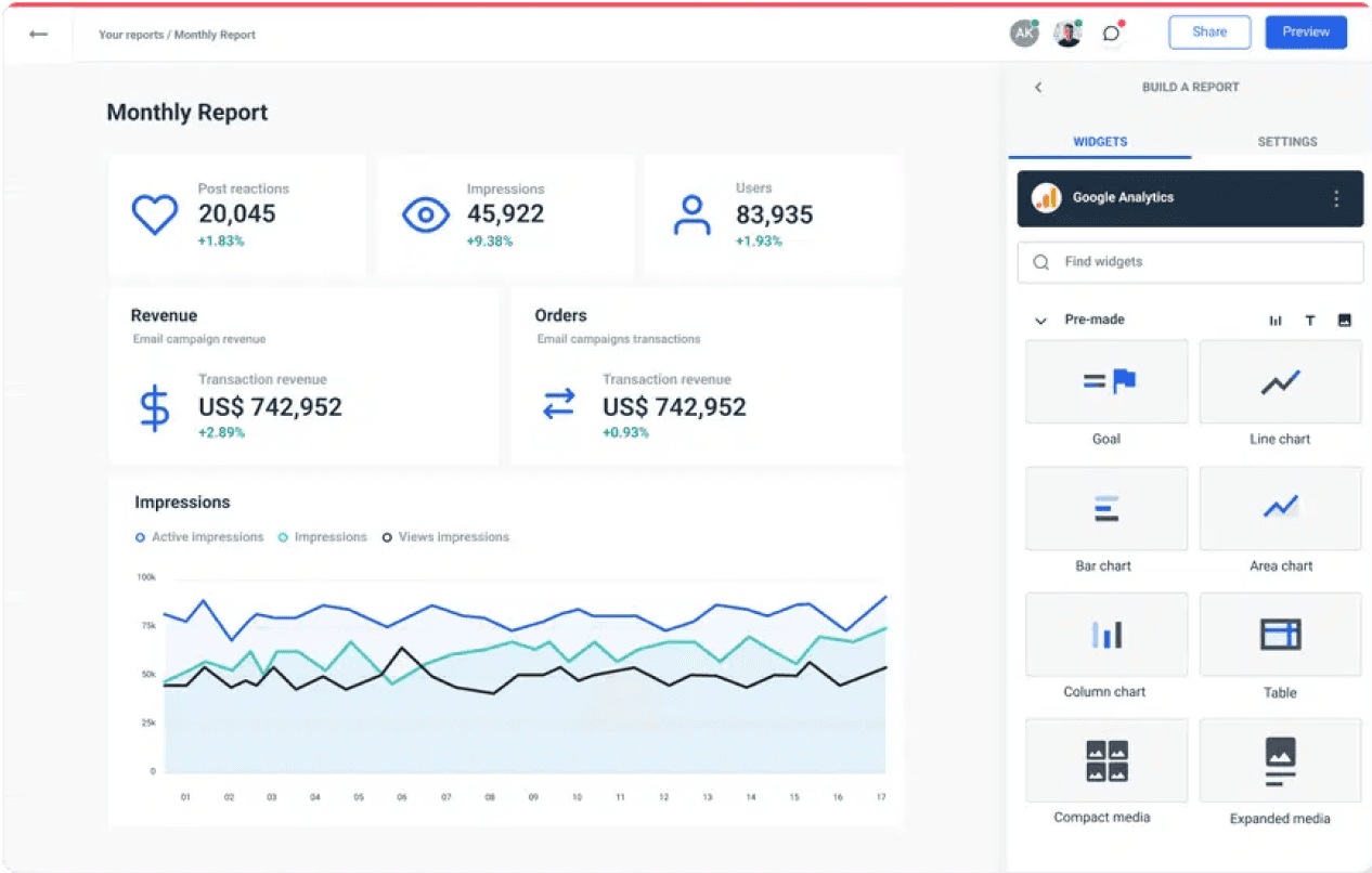 Each module has one main dashboard where you can customize widgets, use ready-made reports, and filter information easily.